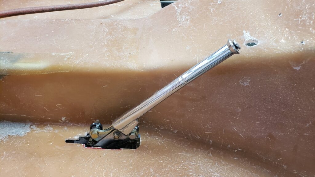 After multiple attempts to make it work, I found a Lokar #EHB-7016 Transmission mount handle. This provided a longer handle which increased the leverage. I modified it to fit the Hurricane frame which became Mod level#2. This mod isn’t recommended, it required substantial modification of the handle which was too long. Shortening it became very complicated.